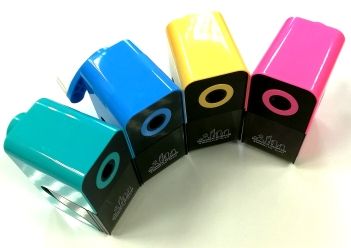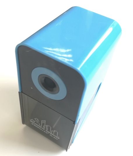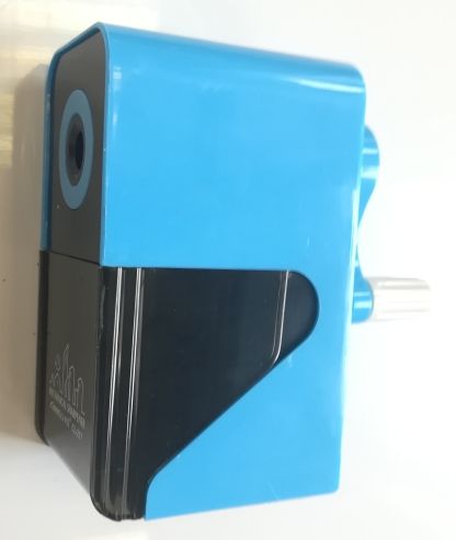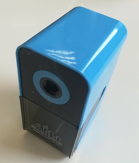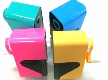 Корпус точилки изготовлен из пластика и оснащен ручкой, которую нужно крутить для затачивания карандаша.
